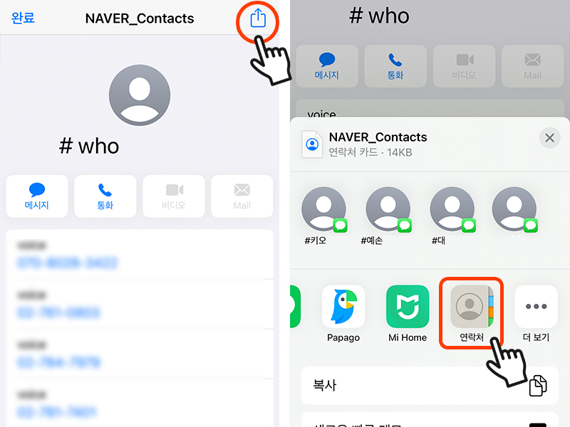 아이폰에서는 다운로드한 파일을 연락처 앱으로 공유하는 과정이 추가로 필요해요 오른쪽 공유 버튼 아이콘을 누르시고 연락처를 눌러줍니다.